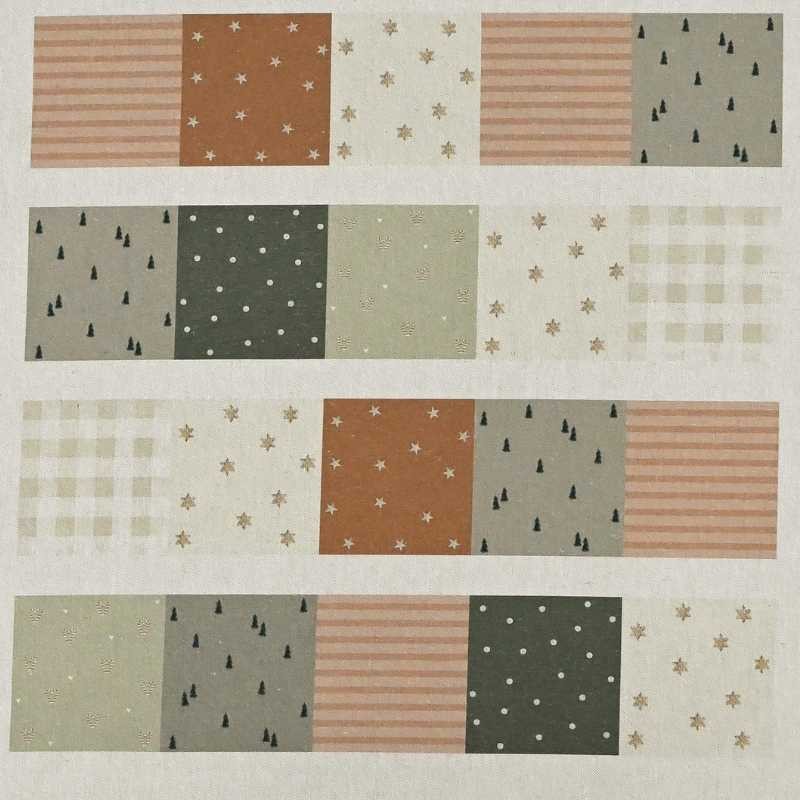 Tela culla calendario de adviento. El fondo de esta tela es de color arena. Los colores de esta tela son natural, tostado, arena, teja, rojo rubí, verde, verde seco, verde botella, marrón y negro. El motivo más grande del estampado mide 6 cm. Los cuadrados miden 9 cm de alto x 9 cm de ancho. Esta tela se vende por paneles y el panel mide 0,85 metros x 1,50 metros de ancho.