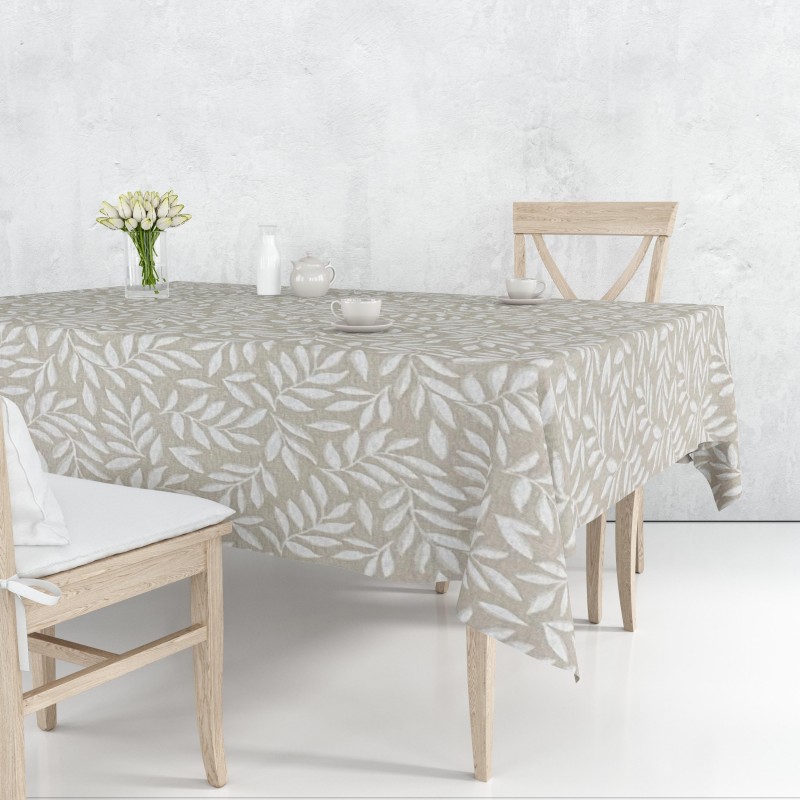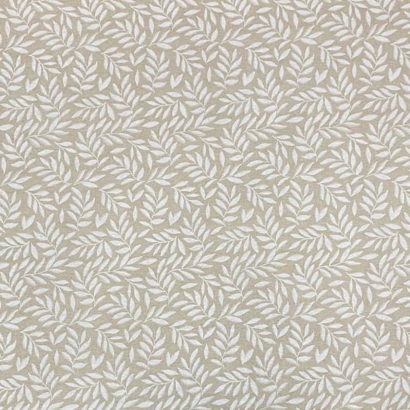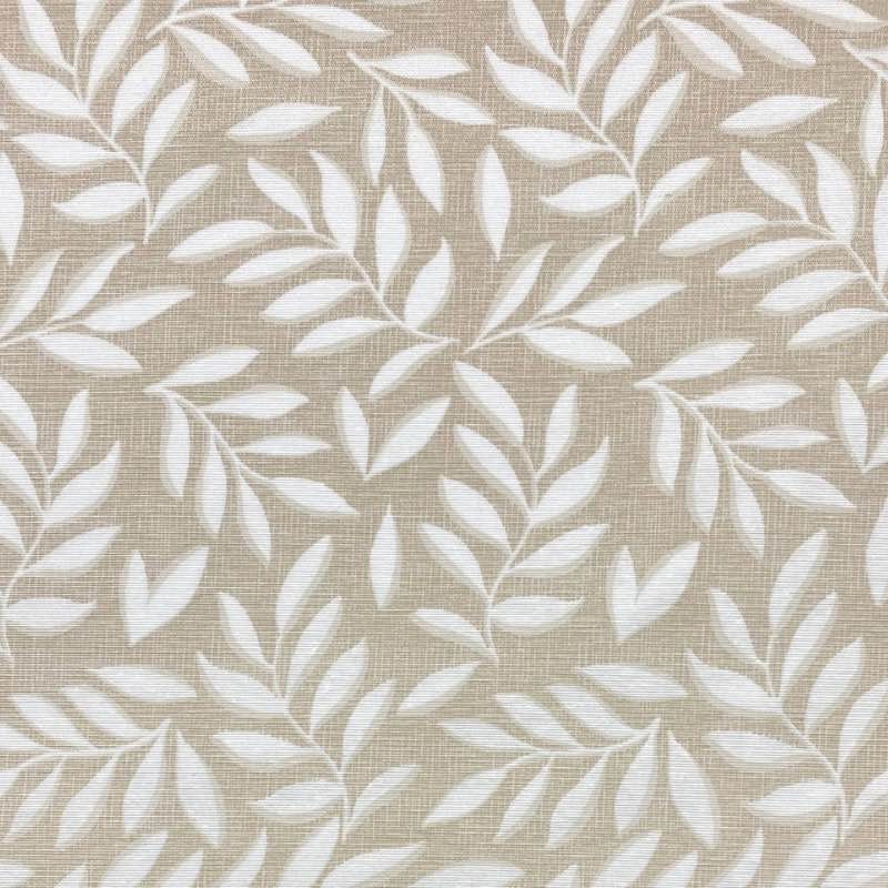 La tela de Antimanchas Patricia tiene un estampado de hojas con fondo color arena a lo largo de todo el tejido.