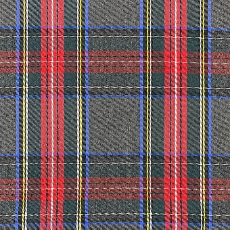 La tela cuadro escocés rojo gris tiene un estampado de cuadrados de 7,5 cm x 7,5 cm aproximadamente en colores rojo, gris, y verde con una pequeña línea blanca, amarilla, azul y negra a lo largo de todo el tejido.