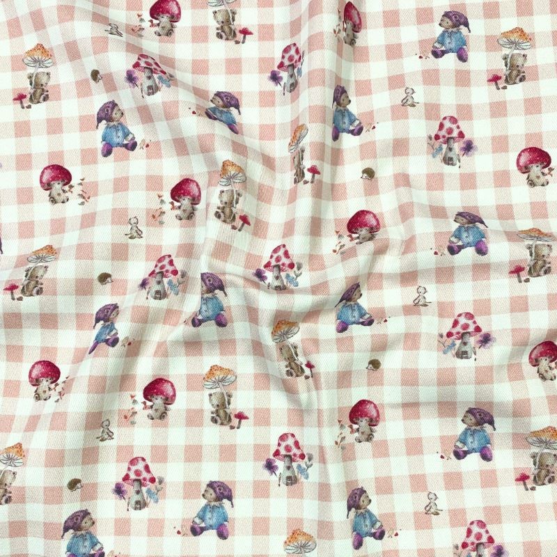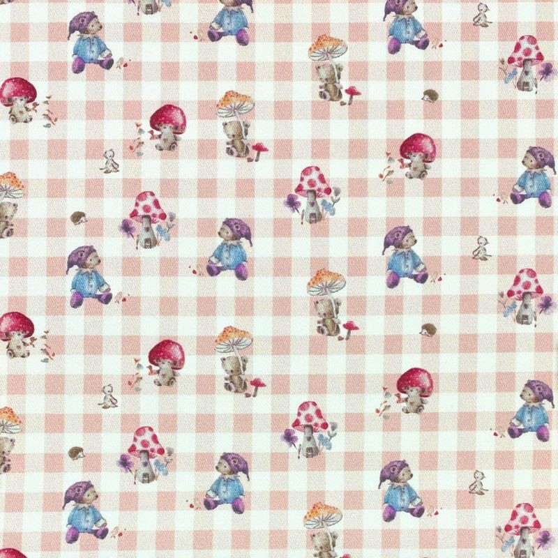 La tela viyela vichy setas tiene un estampado de setas y osos a lo largo de todo el tejido. El fondo de esta tela es de color natural. El motivo del estampado mide 3 cm. Los colores de esta tela son nude, rosa empolvado, rojo rubí, morado, azul, teja pálido, arena y marrón.