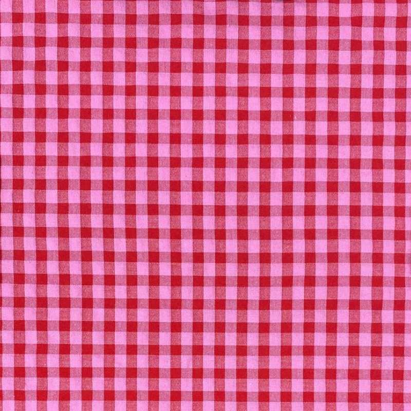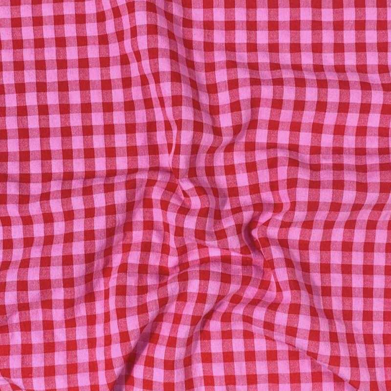 La tela seersucker rosa rojo tiene un estampado de cuadrados en dos colores combinados a lo largo de todo el tejido. Además, tiene un bonito acabado arrugado o también conocido como efecto bambula.