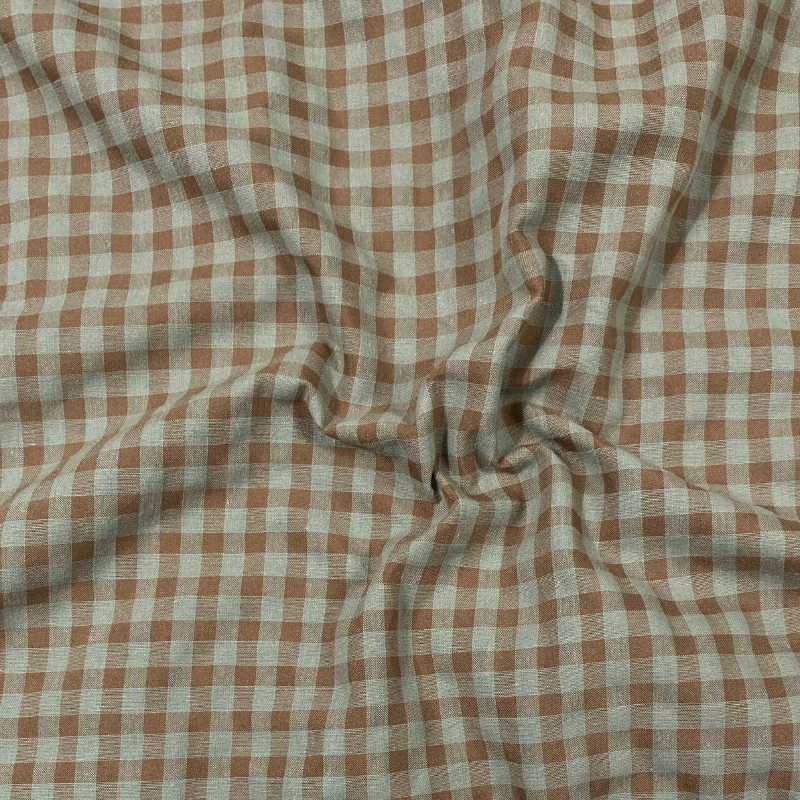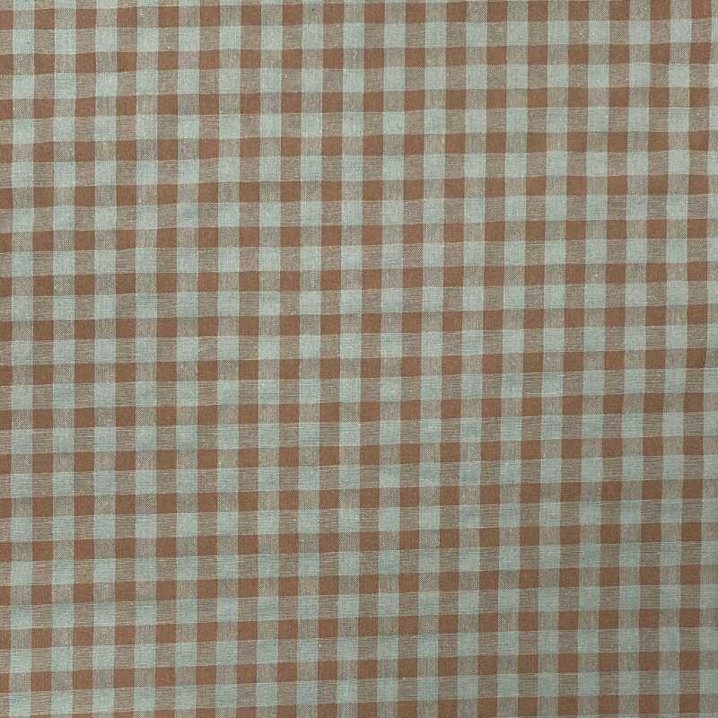La tela seersucker verde mint marrón tiene un estampado de cuadrados en dos tonos, verde mint y marrón a lo largo de todo el tejido. Además, tiene un bonito acabado arrugado o también conocido como efecto bambula.
